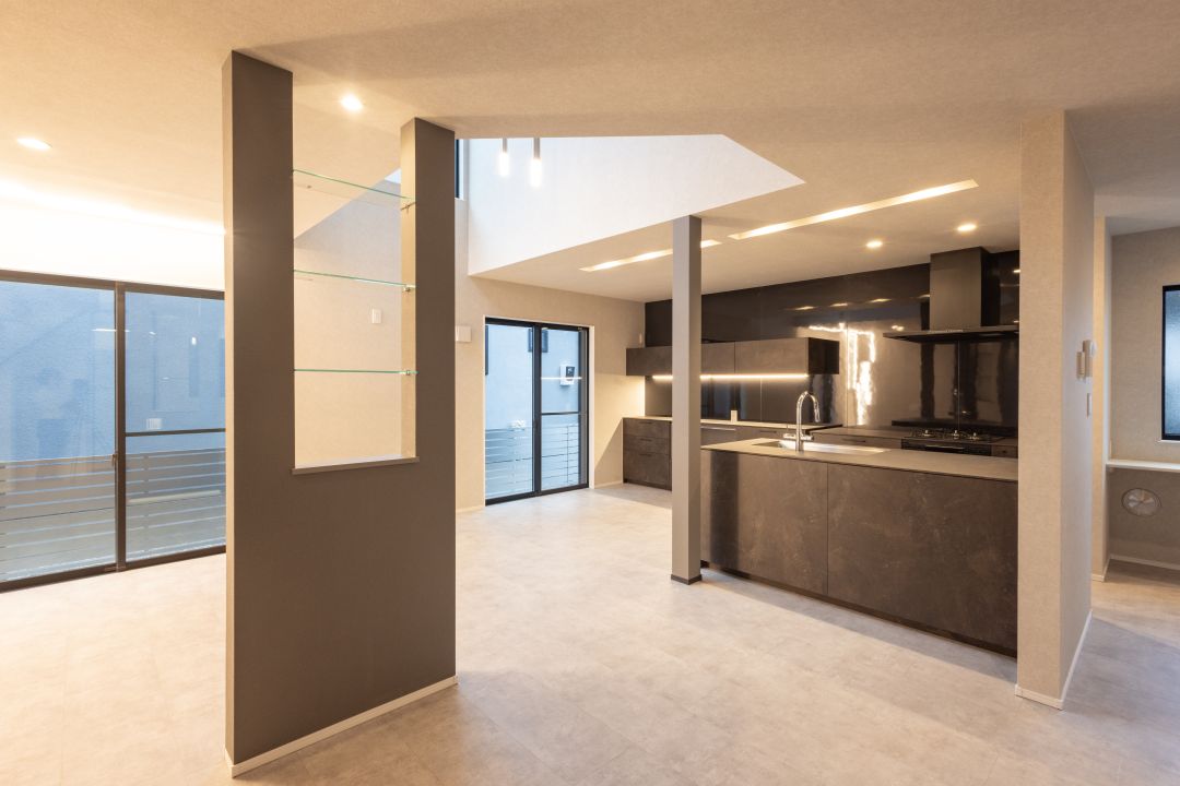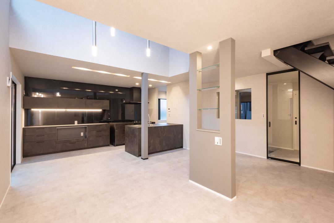 A棟・LDK別角度/高級感のあるキッチンと、空間を緩やかに仕切る飾り棚が特徴の開放的なLDKです