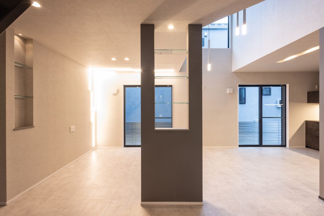 A棟・LDK南側/上下3つの窓を南側に配置した明るいLDK。正面の飾り棚は、構造用の柱をアレンジしています