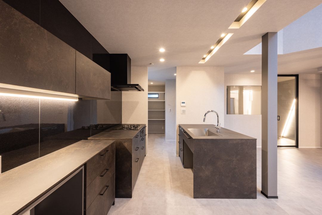 A棟・キッチン/シンクとコンロを別々のカウンターに分けた、「グラフテクト」のII型システムキッチン。キッチンの奥には家事カウンターとパントリーを配置しています