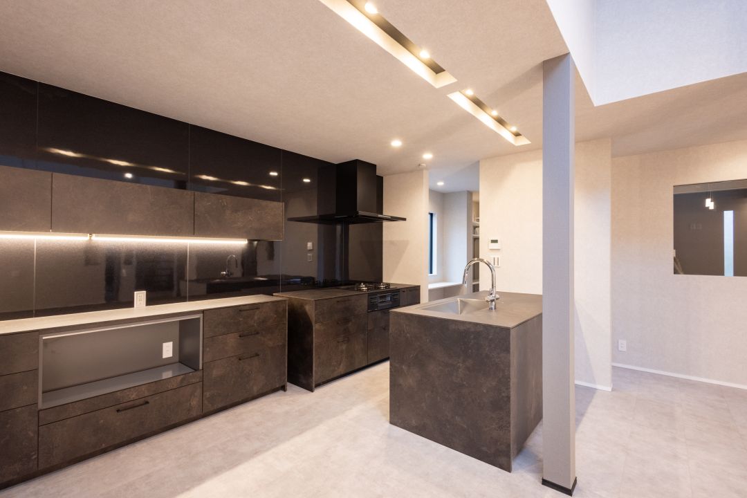 A棟・キッチン別角度/システムキッチン・カップボードともにグラフテクトで統一。分譲住宅ではあまり見ることのない高級キッチンです