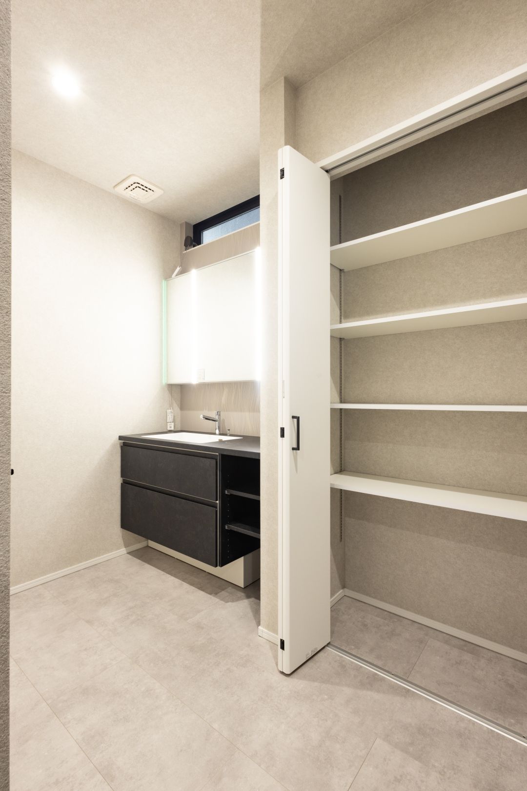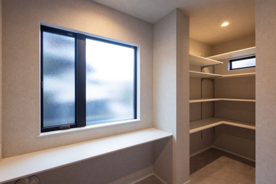 A棟・家事カウンターとパントリー/キッチンの奥には、窓のある明るい家事カウンターと大型のパントリーを配置しました