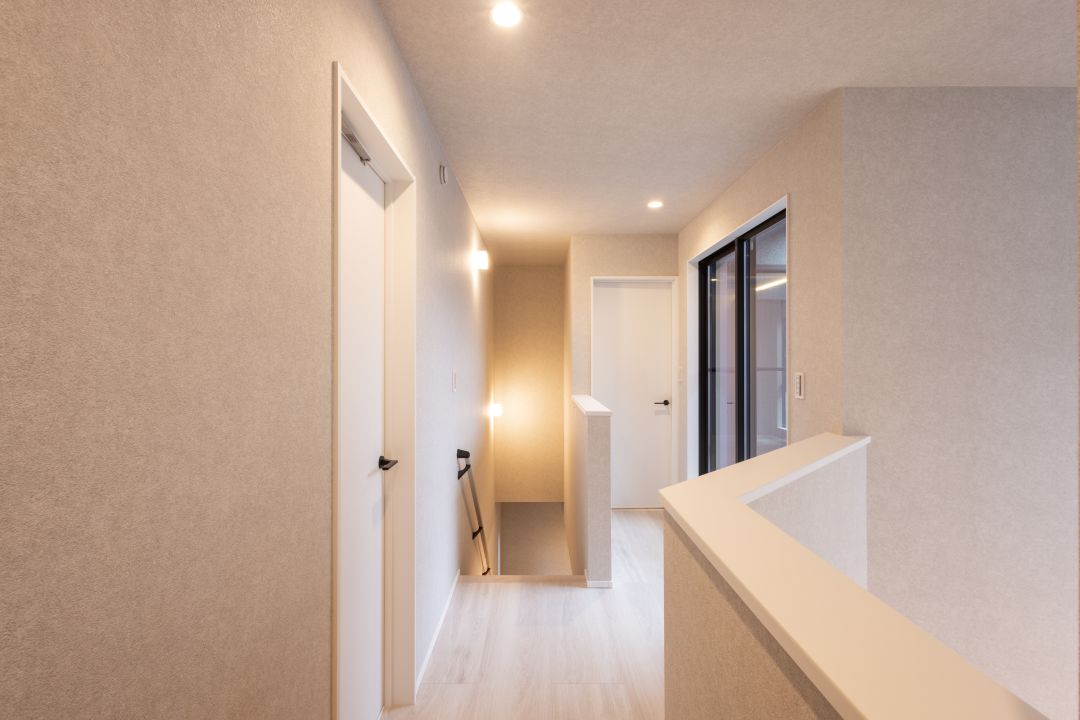 A棟・2階ホール/吹き抜けに沿った明るい2階ホール。右側の窓の向こうはパティオです
