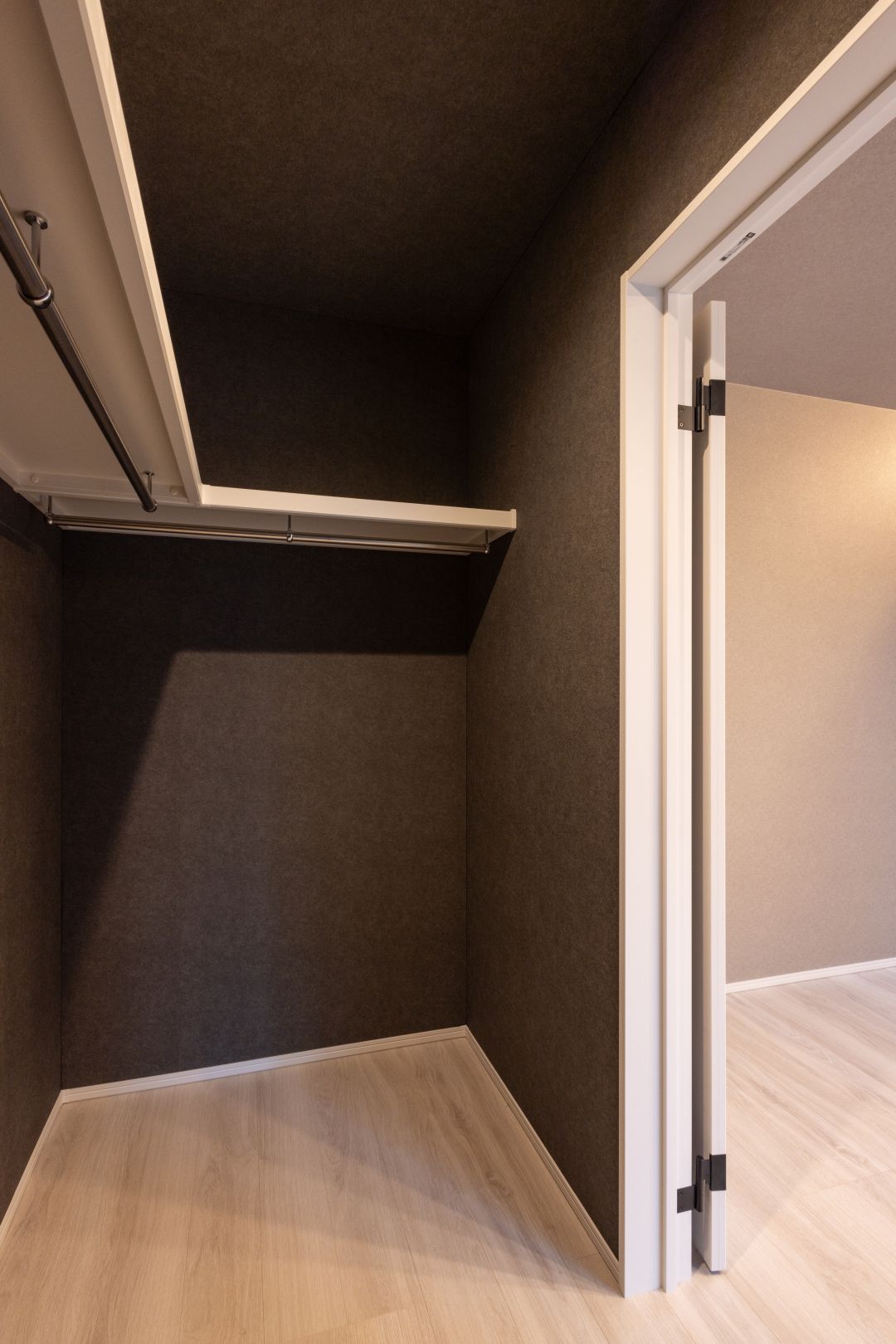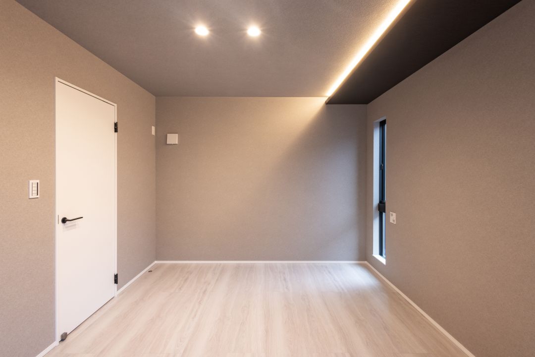 A棟・主寝室/グレーの壁紙で統一した落ち着いた空間。間接照明やダウンライトが温もりを与えます