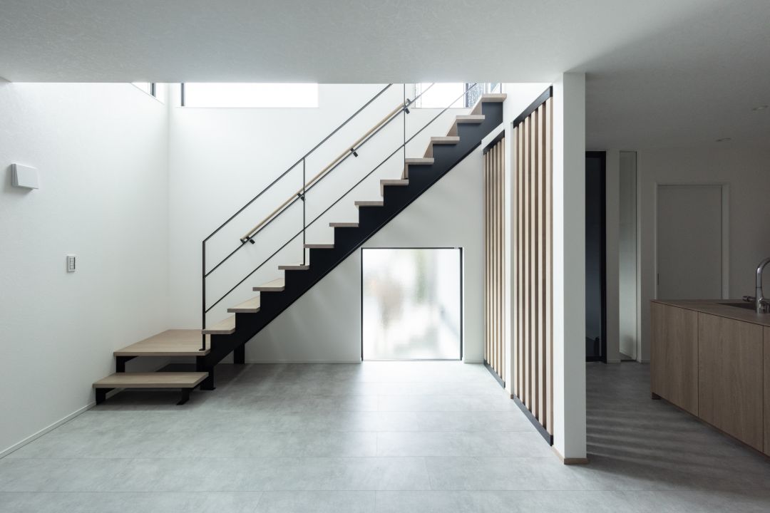 B棟・スケルトン階段/リビングに存在感を放つ、スタイリッシュなスケルトン階段。上下の窓から光が降り注ぐ心地よい空間です