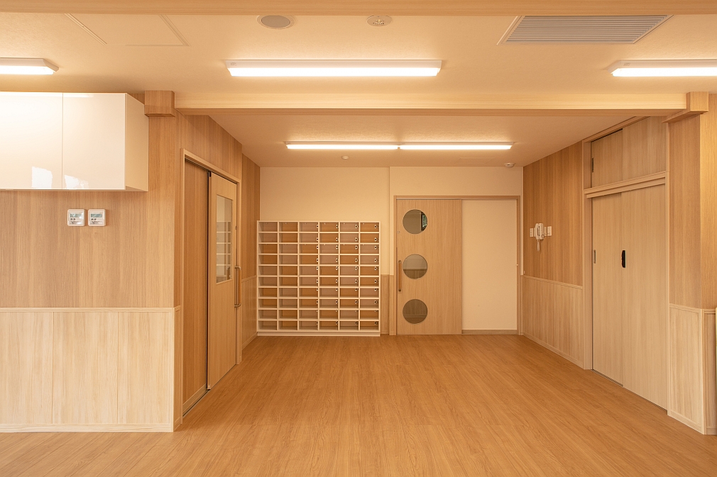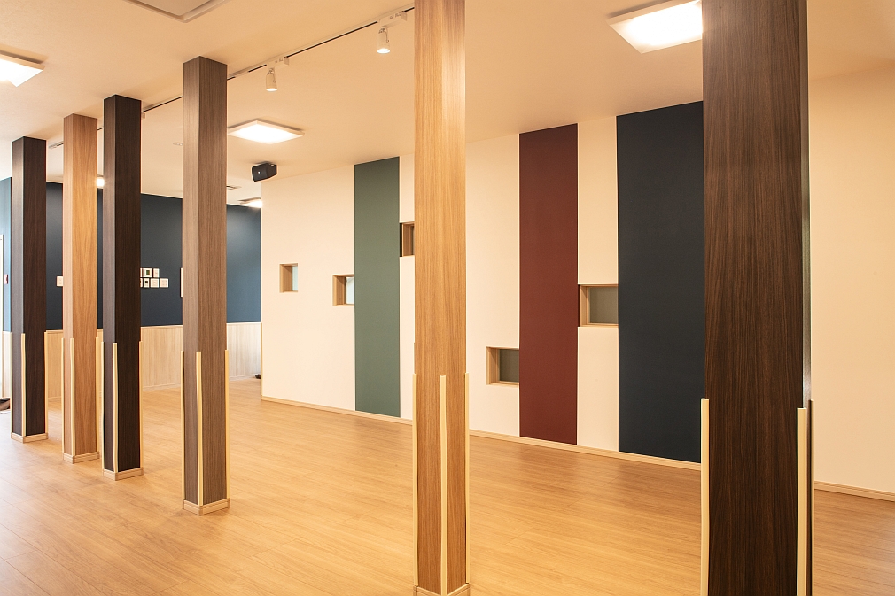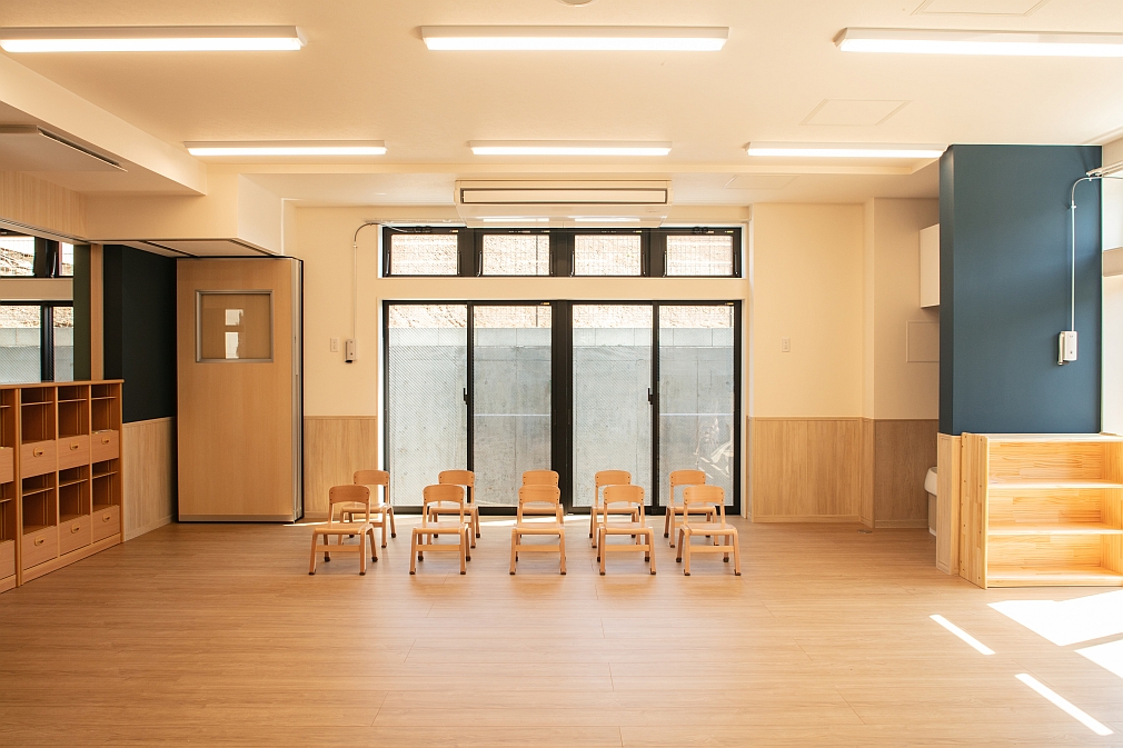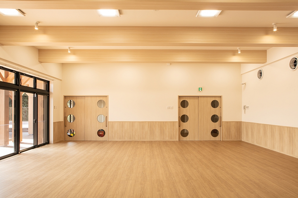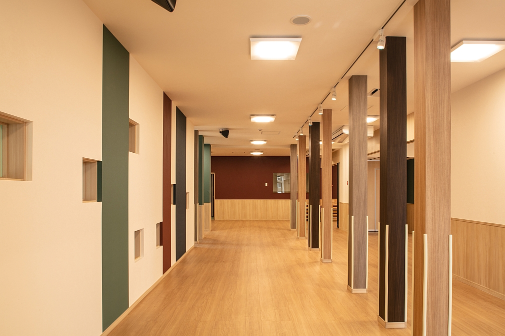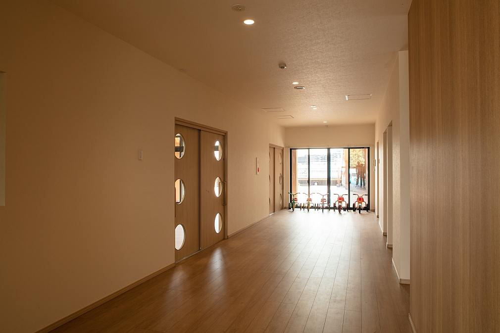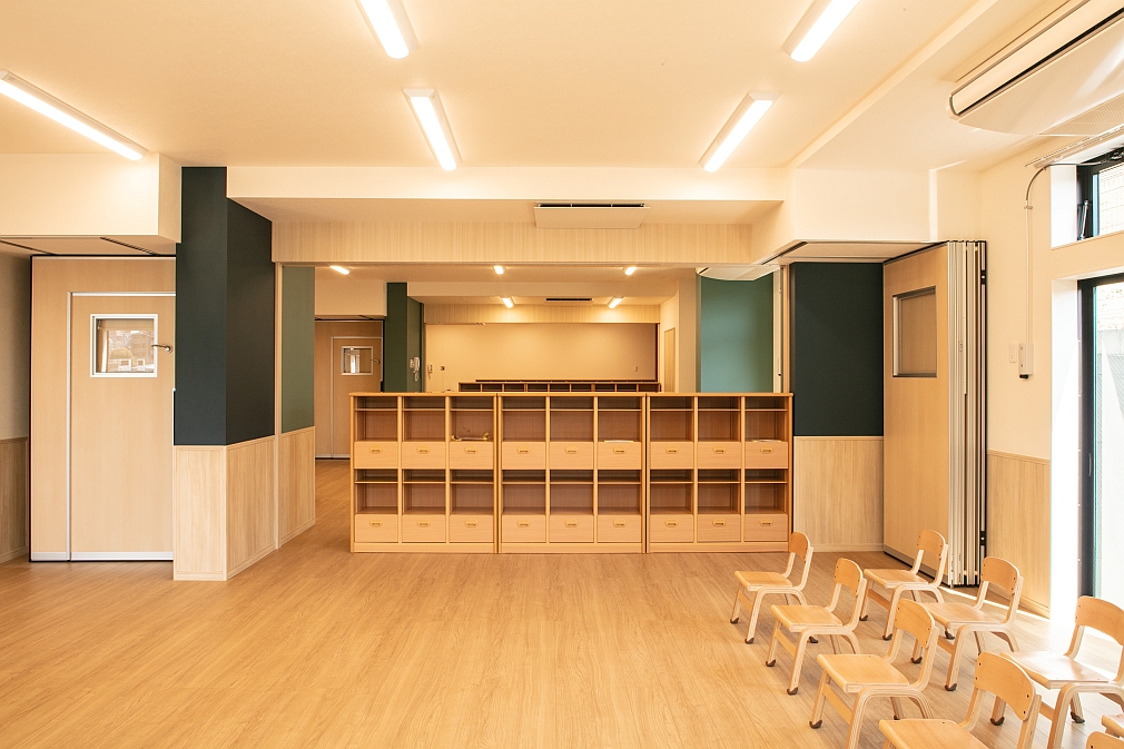 地下1階の廊下と保育室。廊下と保育室は可動式のドアで仕切ることができます