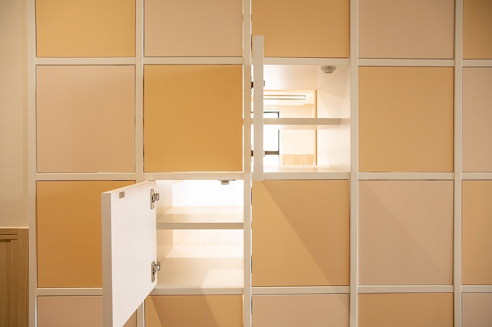 保育室と廊下側の両側から開く収納ボックス