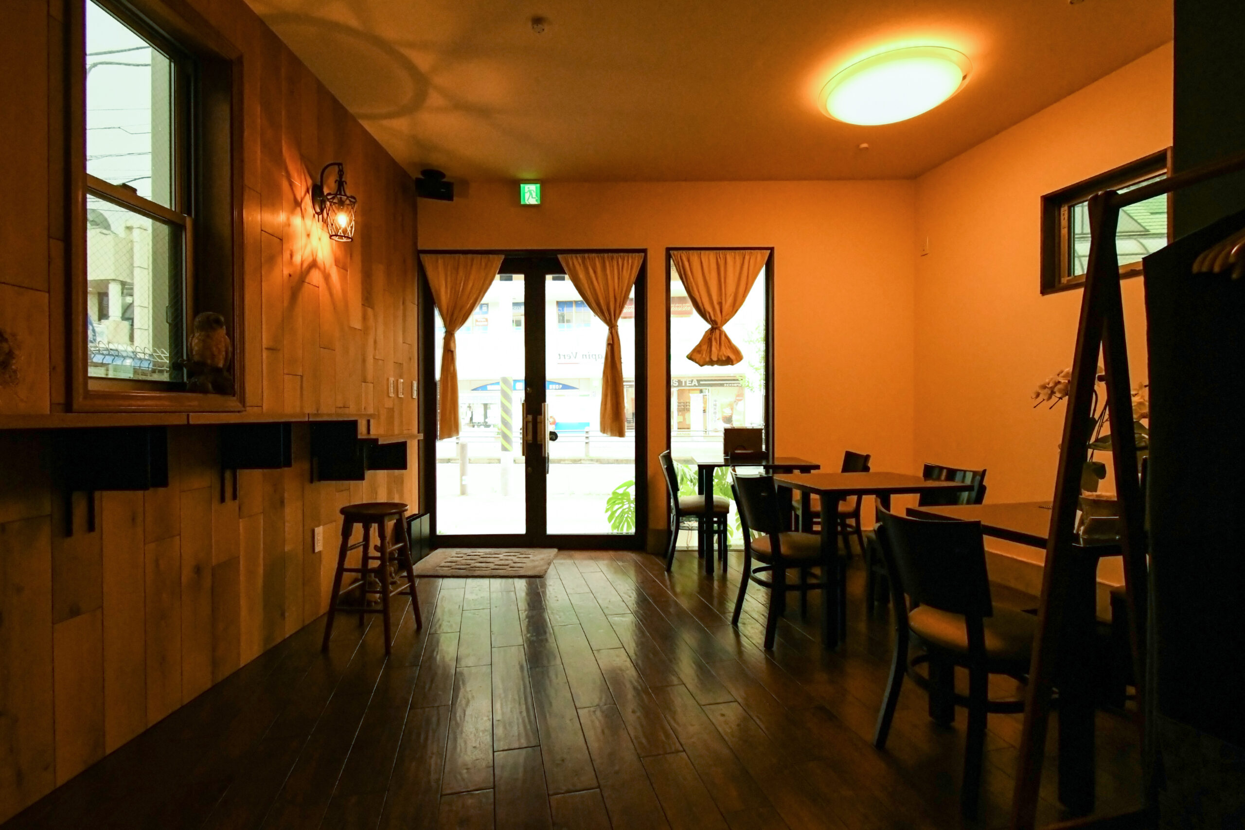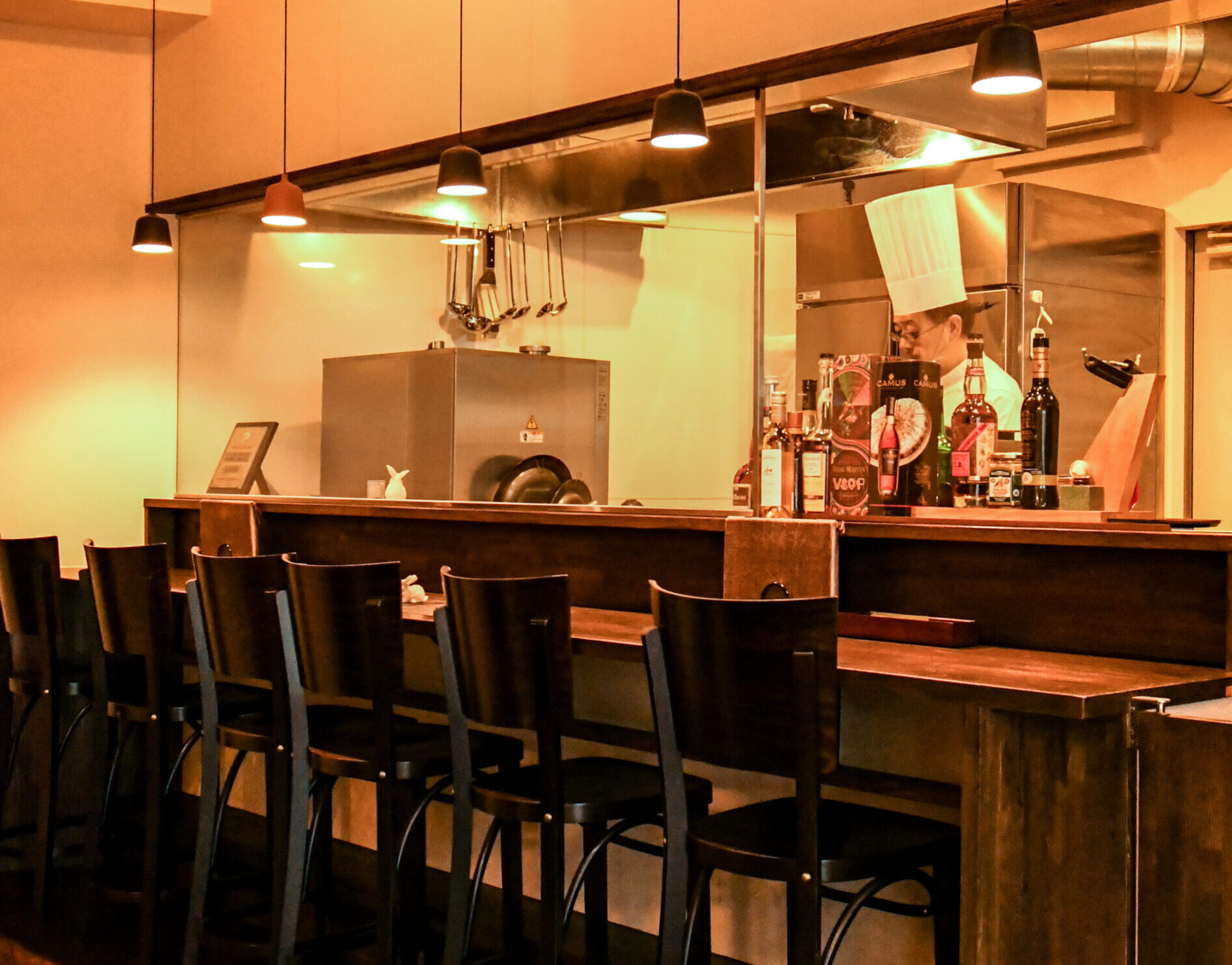 座席はテーブル席やカウンター席の他に、入口近くに立ち飲みカウンターも用意しました。壁にオーク材を張り、エクステリア照明で照らされたカジュアルなスペース。ふらっと立ち寄り、本格フレンチとコスパの良い良質ワインを気軽に楽しんでほしいというふたりの思いが現れたこだわりのスペースです。