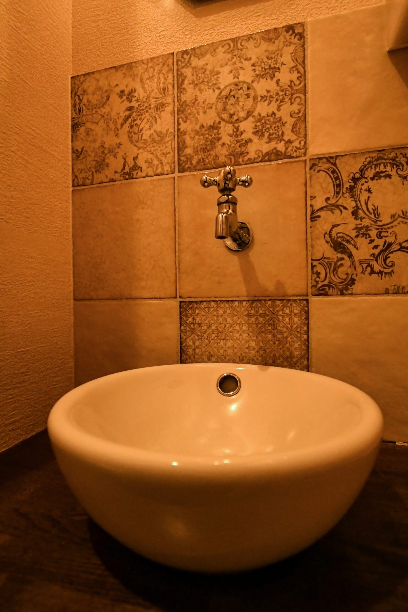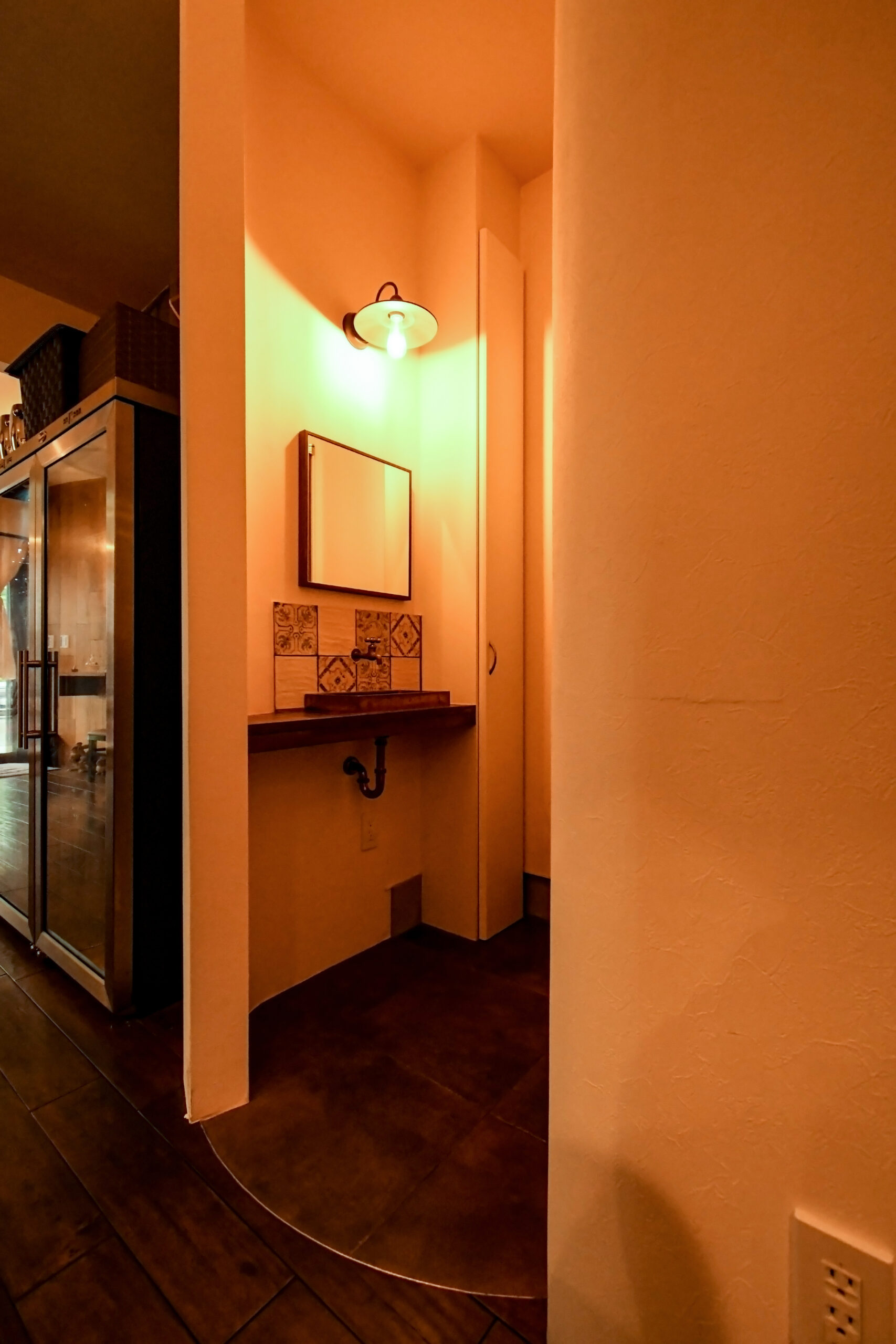 水廻りにもご夫婦のこだわりを詰め込みました。限られたスペースながら、トイレ外に落ち着けるパウダースペースを用意。水掛かりの壁には、奥様こだわりの異国情緒溢れるレリーフタイルをランダムに貼りました。